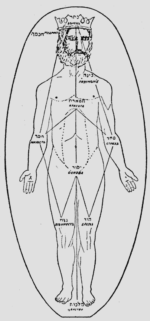 G‑d created a man in His image and His likeness (Genesis 1:27). Kabbalists interpret this verse to mean that the human body reflects the structure of the sefirotic tree: Keter manifest as a skull; ḥokhmah and binah—as two hemispheres of the brain; ḥesed and gevurah—as two arms; tiferet—as torso; netzaḥ and hod—as two legs, Yesod—as the procreative organ; and malḥut—as a female.