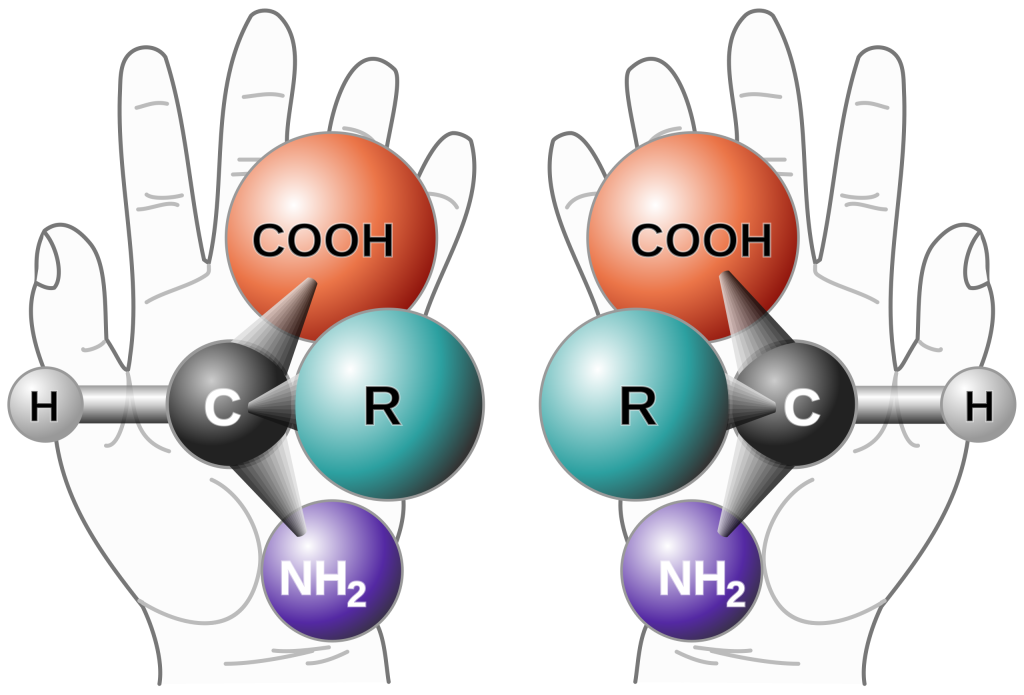 This asymmetry is not incidental. If not for the left-handed asymmetry of amino acids, life would not be possible. Proteins are built from chains of amino acids. Each amino acid has a specific 3D structure due to its chirality. If a protein is made with D-amino acids (right-handed) instead of L-amino acids (left-handed), it would fold differently and not function properly.