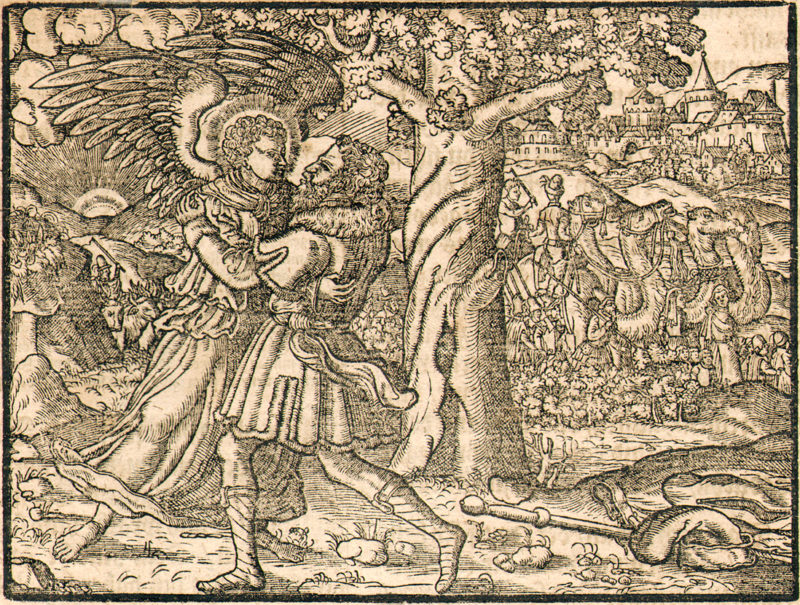 So the present passed over before him; and he himself lodged that night in the camp. And he rose up that night, and took his two wives, and his two handmaids, and his eleven children, and passed over the ford of the Jabbok. And he took them, and sent them over the stream, and sent over that which he had. And Jacob was left alone; and there wrestled a man with him until the breaking of the day. And when he saw that he prevailed not against him, he touched the hollow of his thigh; and the hollow of Jacob’s thigh was strained, as he wrestled with him. And he said: “Let me go, for the day breaketh.” (Genesis 32:23–26)