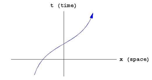 This becomes particularly apparent in light of special relativity. If one attempts to depict a world-line of a particle in the Minkowski space, the time diagram looks like this: