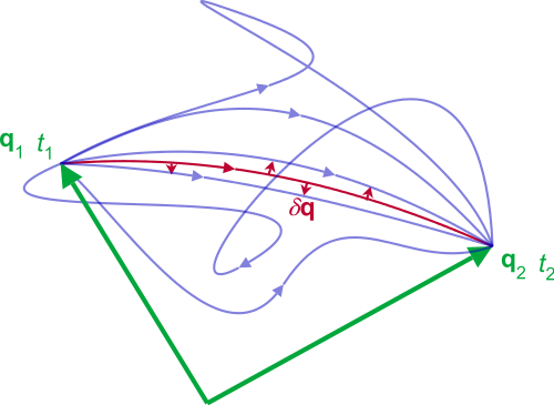 [2] Greek letter δ (“delta”) means variation. It is analogous to a derivative in calculus. When we want to find a minimum or a maximum (an extremum) of a function, we take a derivative of the function. Wherever the derivative is zero, at this point, the function is at its extremal (minimal or maximal) value. Similarly, when dealing with functionals (a function of functions), we vary them to see where the variation is zero—this picks a function that is minimal or maximal with respect to a certain parameter.