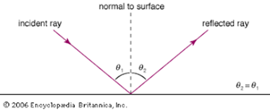 [3] The angle of incidence is the angle between the incoming light ray and the perpendicular line to the reflective surface. The angle of reflection is the angle between the reflected light ray and the same perpendicular line.