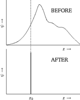 When a left circularly polarized photon goes through a calcite crystal it is detected to be in either vertical or horizontal polarization states. At the moment of the measurement, the state vector being a superposition of two possible states—vertical and horizontal—is suddenly reduced to one actual state: either vertical polarization or horizontal polarization. This is called the collapse of the wavefunction.