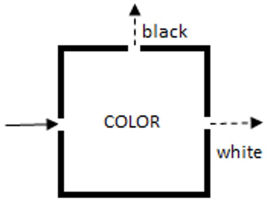Let us suppose that a subatomic particle (say, an electron) has a property we are going to call “color” (it could be the spin of an electron, or the polarization of a photon, etc.). Whatever we mean by “color,” this is a binary property that has only two values—black and white. We can build a color box that has three apertures: one for letting in all (that is, both types of) electrons, one for letting out black electrons, and one for letting out white electrons. The color box does not change the color of the particles that enter it. If we were to send into it a single white electron, it would always (100% of the time) exit through the white aperture and, likewise, if we were to send in a single black electron, it would always exit through the black aperture. The only thing the color box does is to test the color of the electrons and to sort them accordingly. It is a color-sorting apparatus, nothing more.