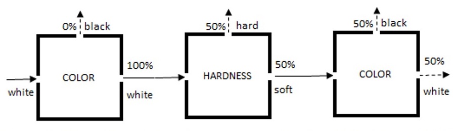 In this experiment, we send only white electrons into the first color box shown on the left of Figure 3. We already know that the color box does not change the color of the particles that pass through it. Therefore, we expect to see 100% of the electrons exiting through the white aperture on the right of the color box. And this is exactly what happens. The white electrons exiting the first color box now enter the hardness box in the middle of Figure 3. The hardness box sorts out the electrons according to their hardness characteristic, with 50% of the electrons exiting through the hard aperture (those are the hard electrons) and 50% exiting through the soft aperture (those are the soft electrons). Now, let us feed all soft electrons exiting from the soft aperture into the second color box on the right of Figure 3. What do we expect to see? We should reasonably expect to see all those electrons exiting the second color box through the white aperture. Indeed, since we sent only white electrons into the middle box, and the middle box supposedly does nothing to these electrons except for checking their hardness, their color should not—or so it seems—be affected. But surprisingly, this is not what happens. In the second color box, fifty percent of the electrons exit through the white aperture, and 50% of the electrons exit through the black aperture. This means that the second color box encountered 50% white electrons and 50% black electrons. But from where did the black electrons come?