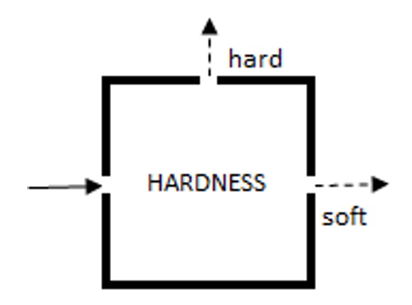 Let us suppose that a particle (say, an electron) also has a property we are going to call “hardness.” Like color, hardness is a binary property that has only two values—in this case, hard and soft. We can also build a hardness box that has three apertures: one for letting electrons in, one for letting out hard electrons, and one for letting out soft electrons.